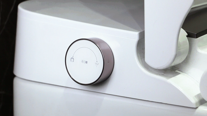 秉承着“功能强大、操作简单”的设计理念,惠达HDE3012T智能马桶在机身右侧设置了可360度旋转的无极旋钮,通过旋转、按压旋钮,就能完成开/关机、臀部清洗、女性清洗、冲水、停止、烘干等一系列的功能操作。