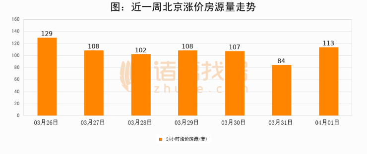 根据诸葛找房数据显示,北京24小时涨价房源量为113套,较03月31日增加29套,环比上涨34.5%。与此同时,涨价房源占比小幅扩大,业主信心有所提升。