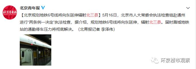 5月16日,北京市人大常委会执法检查组赴通州进行“两条例一决定”执法检查,据介绍,规划地铁6号线将向东延伸,辐射北三县。