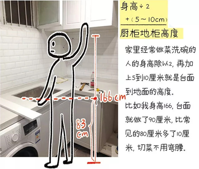 家里常做饭的人身高除以2,再加5~10cm,就是橱柜台面到地面的高度。例:PP身高166cm,台面做成90cm,比常见的80cm稍高,切菜时不必弯腰。