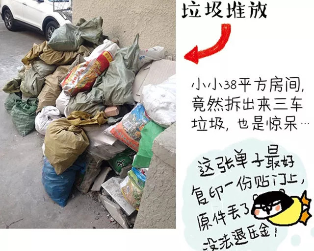 新小区的押金一般按房屋面积计算,每平方米几元钱;垃圾先堆在楼下指定位置,再由物业或工长派车运走,每车大概400元,PP家仅仅38平,就拆出了3车垃圾。