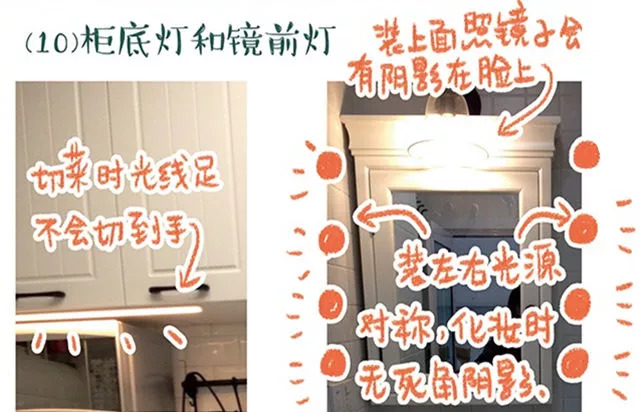 吊柜下安装人体感应灯,手一伸,灯就亮,切菜时,光线足,不容易切到手。