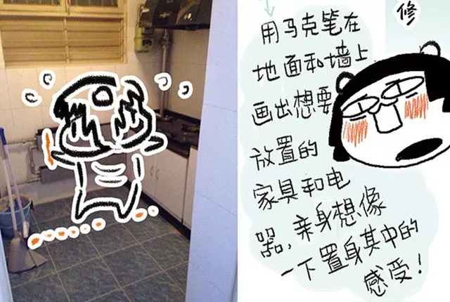 具体操作是:在地面和墙上,用马克笔画出想要放的家具和电器的位置,想象一下“置身其中”的感受,比如在客厅里,就假装自己躺在沙发上,想象电视就在眼前……
