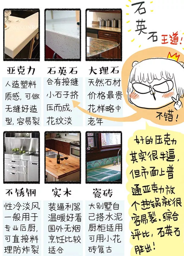 各种材料优劣列举如下,综合比较,PP选择了石英石。