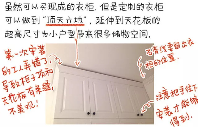在铺好地板以后,也要请衣柜师傅复尺,精确测量地板到天花板的高度;安装屋顶的石膏线时,记得留下衣柜的位置。