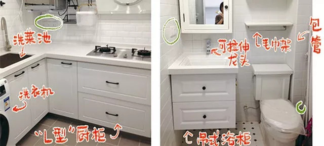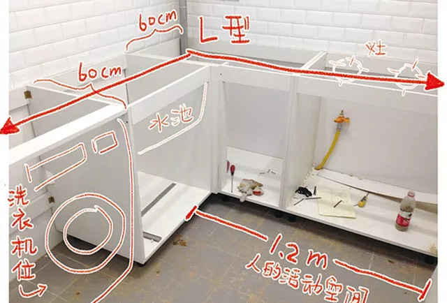 瓷砖贴好后,橱柜和浴室柜也要复尺。因为小房间里,就怕柜子做大了塞不下。