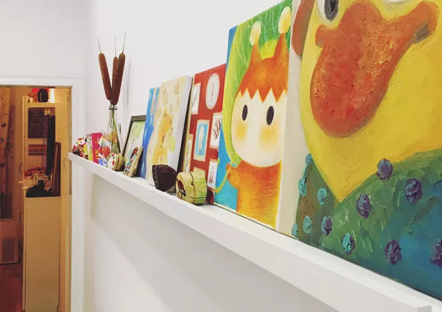 利用走廊长长的墙壁, PP摆上得意的画作和手工,来迎接客人。