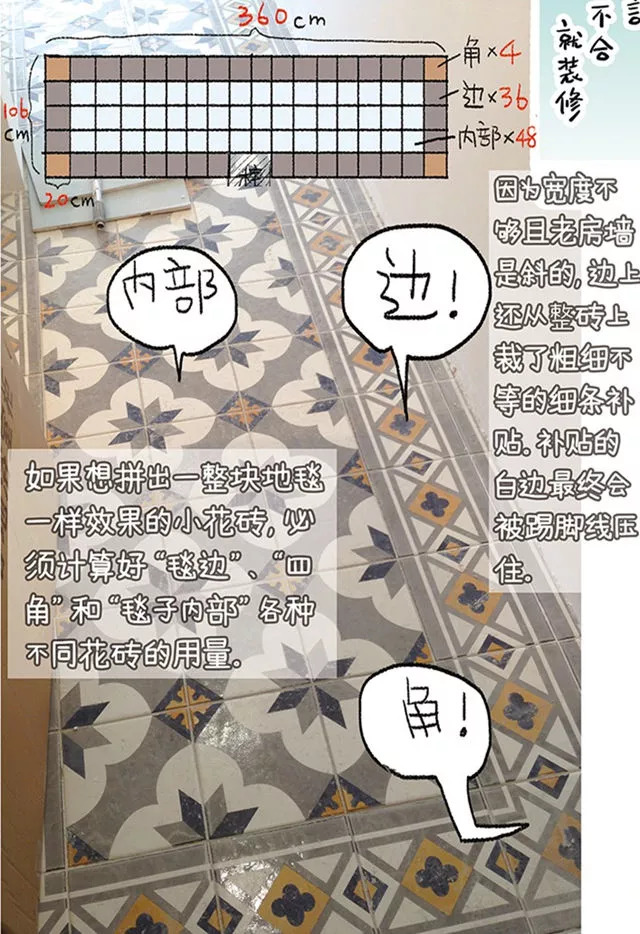 但是,PP为了在玄关,拼出整块地毯的效果,要分别计算出「毯边」、「四角」和「毯子内部」不同花砖的数量。