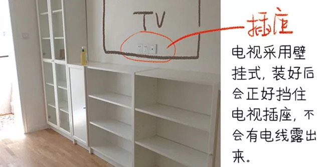 为了藏书,PP的电视柜也是书柜,比普通的电视柜高,因此电视插座要上挪,免得被书柜挡住。再记住电视尺寸,让插座正好藏在电视后面,不会有电线露出来。如果记忆困难,可以在画标记前,将尺寸写在墙上,在藏在电视后面就好了。