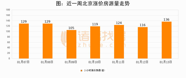 根据诸葛找房数据显示,北京24小时涨价房源量为136套,较01月12日增加20套,环比上涨17.2%。与此同时,涨价房源占比小幅扩大,业主信心有所提升。