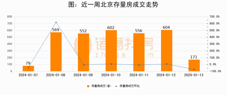 从存量房来看,2024年01月13日北京存量房单日成交171套,比昨日减少433套,环比下降71.7%。从近一周存量房成交来看,北京存量房日均成交套数为447套,01月13日单日成交171套,低于近一周平均水平61.7%。