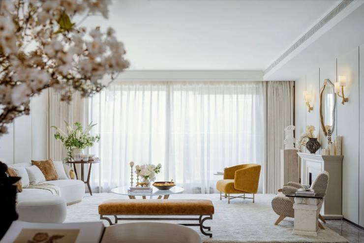 三个全新样板间围绕主流客群需求打造,重构了空间、材质、色彩及工艺之间平衡。如215㎡样板间,全屋以暖白和米黄为主色,创新地在多处使用了弧形元素,悬浮感吊顶与曲面墙体中和了传统直角设计,增添了家的灵动与包裹感;252㎡现代轻奢户型整体融合了奢石、金属、皮革等材质的应用,兼具时尚感和舒适度。特别是在无梁客厅中心处,设计了通体鎏金色调的功能玄关和一体化吧台,增添仪式感之外,提升了空间的私密性;261㎡则以现代白法设计风格为底,基调浪漫、洁净,整面落地窗的视野极致通透。雕花出风口、拼花地板等细节的处理令人印象深刻。