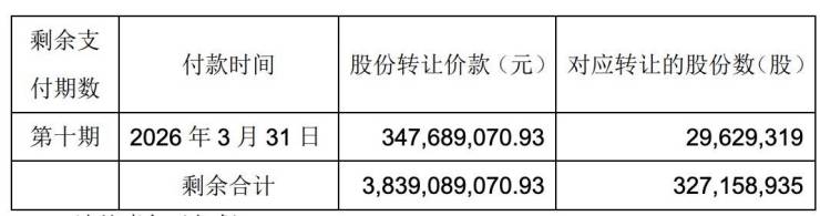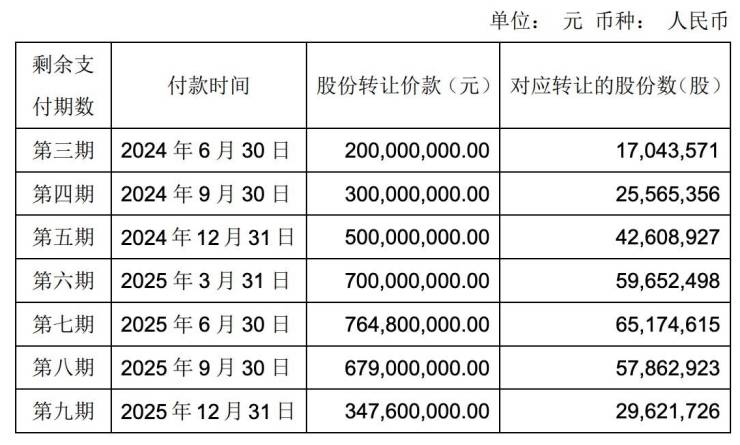 调整的情况如下:本次转股的剩余股份转让价款合计3839089070.93元共分八期(具体为第三至第十期,其中第三期已于2024年6月30日前完成足额支付)支付。购买方应按照如下进度向公司指定账户支付剩余股份转让价款。