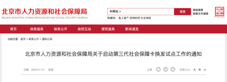 1月31日,北京市人力资源和社会保障局发布消息,本市即日起启动第三代社保卡试点换发工作。