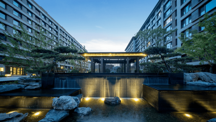 实景交付,渐入佳境:层叠水系、精工亭台与成树移栽的全维度呈现;外立面并非局部示范,石材+铝板的组合成了一道独立风景线。