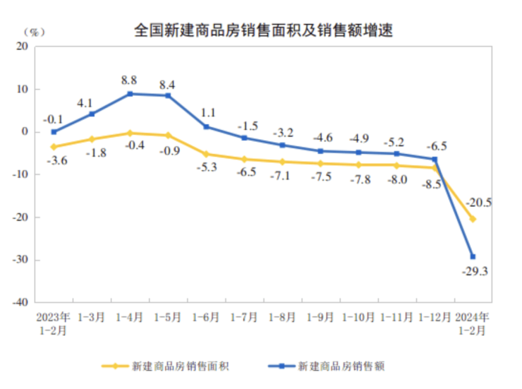 从销售端情况来看,国家统计局数据显示,1-2月份,新建商品房销售面积11369万平方米,同比下降20.5%,其中住宅销售面积下降24.8%。新建商品房销售额10566亿元,下降29.3%,其中住宅销售额下降32.7%。