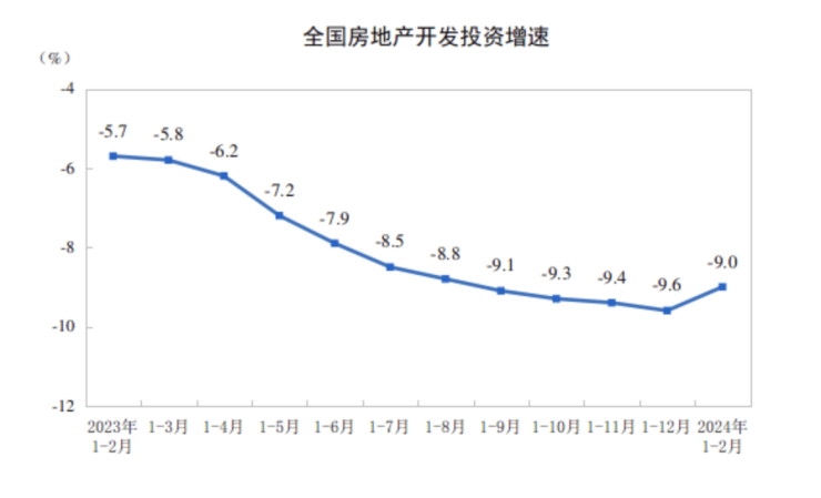 国家统计局数据显示,1-2月份,全国房地产开发投资11842亿元,同比下降9.0%(按可比口径计算),降幅较2023年1-12月收窄0.6个百分点。其中,住宅投资8823亿元,下降9.7%。