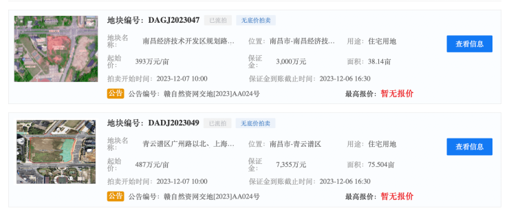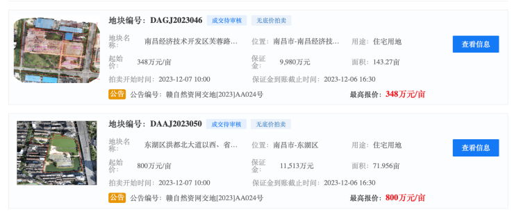 12月7日,江西省南昌市出让4宗涉宅用地,2宗底价成交,2宗流拍,揽金10.74亿元。