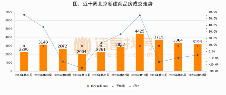 进入2023年第16周(04月10日-04月16日),北京新建商品房成交3194套,较上周减少170套,环比下降5.1%。从近十周成交来看,周均成交套数为2993套,本周成交3194套,高于近十周平均成交量6.7%。