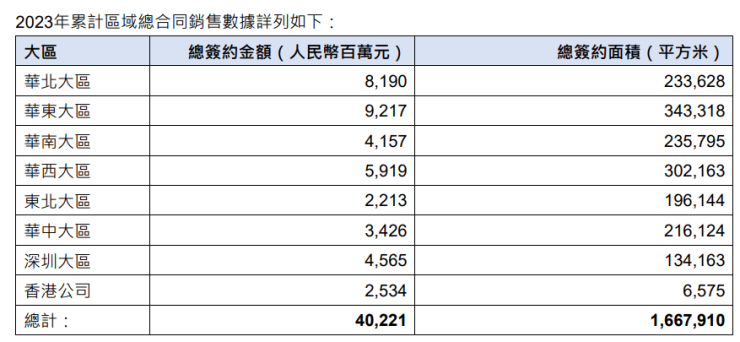 从各大区的销售情况来看,华东大区的总签约金额最多,达92.17亿元,总签约面积为343318平方米;紧随其后的为华北大区,总签约金额达81.9亿元,总签约面积为233628平方米。