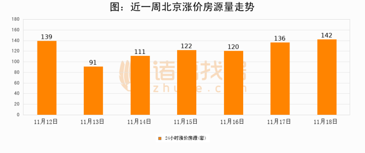 根据诸葛找房数据显示,北京24小时涨价房源量为142套,较11月17日增加6套,环比上涨4.4%。与此同时,涨价房源占比小幅扩大,业主信心有所提升。