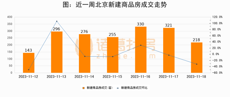 根据北京市住房和城乡建设委员会数据显示,2023年11月18日北京新建商品房成交218套,较昨日减少103套,环比下降32.1%