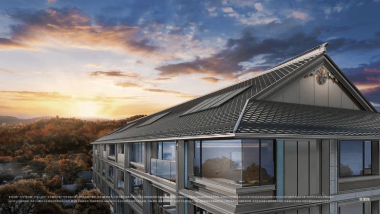 九脊殿龙鳞瓦,配合定制悬鱼樾,形成“鱼跃龙门、步步高升”的美好寓意。南向立面将传统文化引入,通过天青色仿汝窑定制陶板的创新性运用,配合雅奢金铝板的线条刻画,实现“石嵌金、金镶玉”的高贵感受。