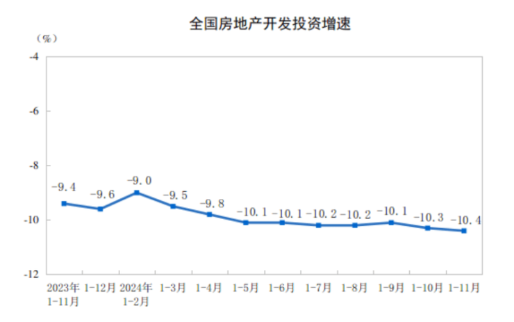 国家统计局数据显示,1-11月,全国房地产开发投资约9.36万亿元,同比下降10.4%;其中,住宅投资约7.12万亿元,下降10.5%。此外,1-11月,房地产开发企业房屋施工面积72.6亿平方米,同比下降12.7%。其中,住宅施工面积50.84亿平方米,下降13.1%;房屋新开工面积6.73亿平方米,下降23.0%。