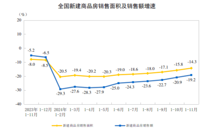 12月16日,国家统计局发布2024年1-11月全国房地产市场基本情况。其中,1-11月,全国房地产开发投资约9.36万亿元,同比下降10.4%;1-11月新建商品房销售面积8.6亿平方米,同比下降14.3%;新建商品房销售额8.5万亿元,同比下降19.2%。