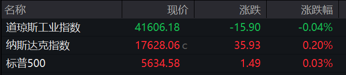 周二,美股三大指数收盘涨跌不一,道指、标普指数盘中创新高。道指跌0.04%,报41606.18点;纳指涨0.2%,报17628.06点;标普500指数涨0.03%,报5634.58点。