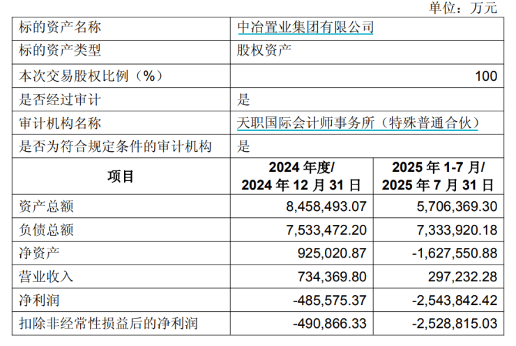 公告显示,中冶置业作为房地产公司,经营面临压力,已经资不抵债。截至2025年7月31日,中冶置业总资产570.64亿元,负债总额733.39亿元,净资产为-162.76亿元;1-7月营业收入29.72亿元,净亏损254.38亿元。