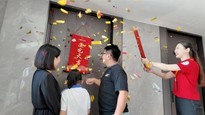 为恭迎业主回家,卓越柏奕府的工作人员早早就开始布置交房现场,红毯、灯笼等装点着交付的喜悦,从小区入口、园林,再到入户仪式,层层递进,尽显归家仪式感。