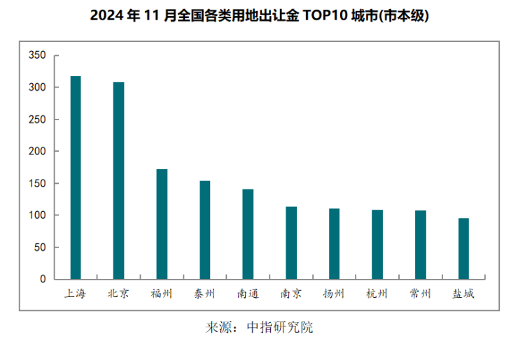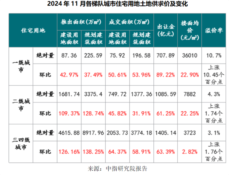 据中指研究院数据,今年前11月,全国300城住宅用地土地出让金同比增长23.4%,土地市场出现边际改善,各线城市土地出让金和溢价率均有所上行。