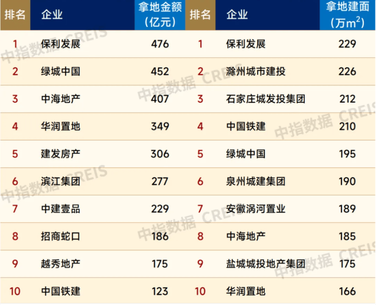 此外,中海地产、绿城中国、华润置地均在三个城市的拿地金额榜上排在前十位;民营房企滨江集团聚焦杭州,在杭州稳居拿地金额榜第一。