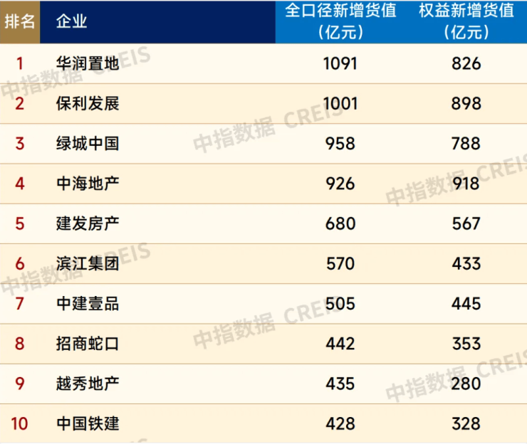 从新增货值来看,今年前11月,华润置地、保利发展和绿城中国排在房企全口径新增货值前三位,分别为1091亿元、1001亿元和958亿元。TOP10企业前11月全口径新增货值总额为7037亿元,占TOP100企业的32%,全口径新增货值门槛为100亿元。