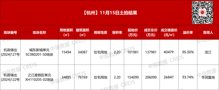11月15日,浙江省杭州市成交2宗住宅用地,均溢价逾33%,成交总额34.408亿元。其中,滨江集团以13.8亿元、溢价率35.3%竞得城东新城地块;之江单元地块由华润置地以20.6亿元拿下,溢价率33.74%。2宗住宅用地均未设置商品房销售限价,总出让面积50389平方米,总规划建面110856平方米,总起始价25.608亿元。