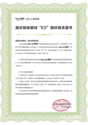 为了给中国家庭带来更加时尚健康的家居生活,我乐家居一直秉承健康环保理念,所有柜体均采用“E0”级环保板材(甲醛释放量≤0.06mg/m³),比国家标准“E1”级更严格,同时我乐家居还与每一位消费者签订环保承诺书,广受消费者好评。