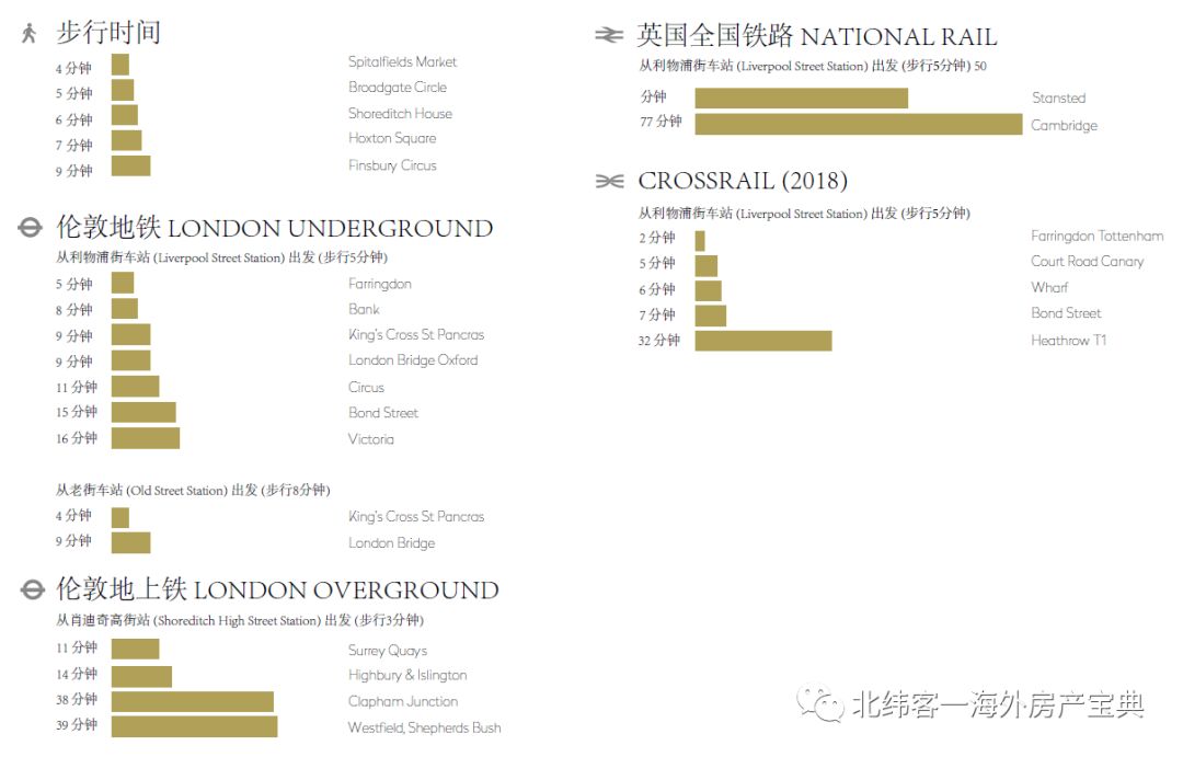 距离利物浦街地铁站--8分钟步行路程;地面轨道交通Cross Rail亦将于2018年在该站通车,届时从该站前往伦敦希思罗机场仅32分钟