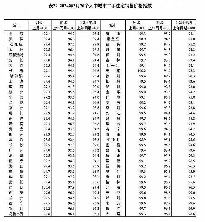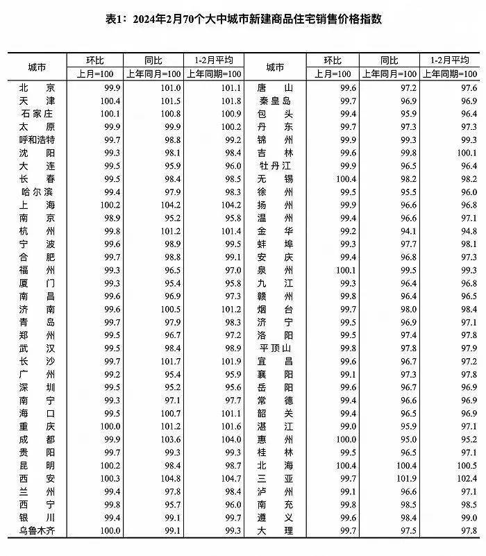 2024年2月份70个大中城市中各线城市,商品住宅销售价格环比降幅总体继续收窄,同比继续下降。
