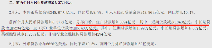 虽然2月住户中长期贷款减少1038亿,结合1月住户中长期贷款的情况,前两月累计下来,房贷增加了5234亿,比去年同期是要多2140亿。
