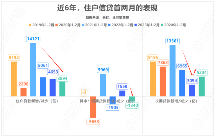 前2月,住户贷款增加3894亿,其中短期贷款减少1340亿,中长期贷款增加5234亿。