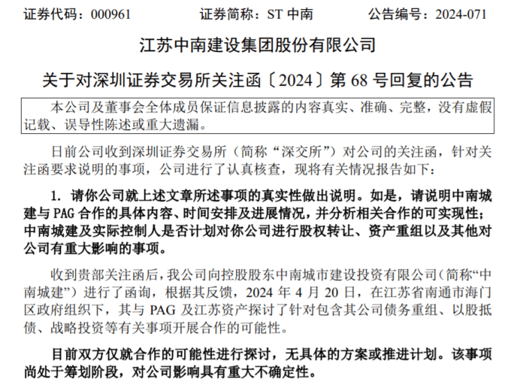 中南建设在此后的回复函中表示,双方仅就合作的可能性进行探讨,无具体的方案或推进计划。“该事项尚处于筹划阶段,对公司影响具有重大不确定性。”