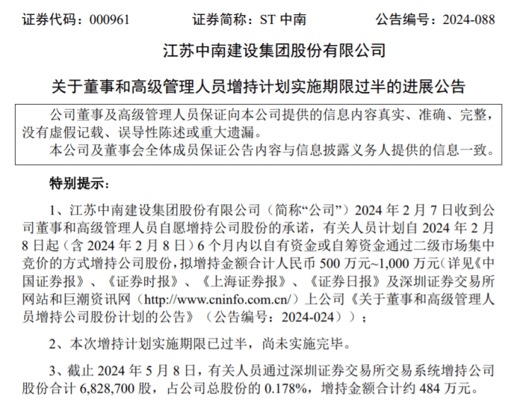 5月6日至8日,中南建设5名董事施锦华、赵桂香、朱挺峰、陈金星、夏佐波和董事会秘书梁洁陆续增持公司股份471.68万股,合计增持金额271万元。增持计划实施3个月,中南建设的董事及高管累计增持金额共计484万元。