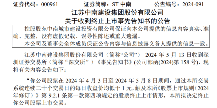 5月13日晚间,中南建设(ST中南:SZ000961,股价0.56元,市值21.43亿元)公告称,于5月13日收到深交所发出的终止上市事先告知书,公司股票在2024年4月3日至5月8日期间,连续20个交易日的每日收盘价均低于1元,深交所拟决定终止公司股票上市交易。