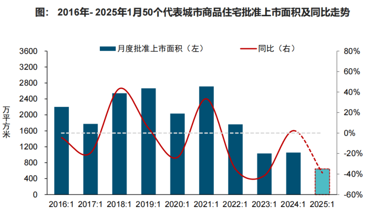 据中指研究院初步统计,2025年1月,50个重点城市批准上市面积同比下降39%,单月供应规模处于2016年以来的同期最低。