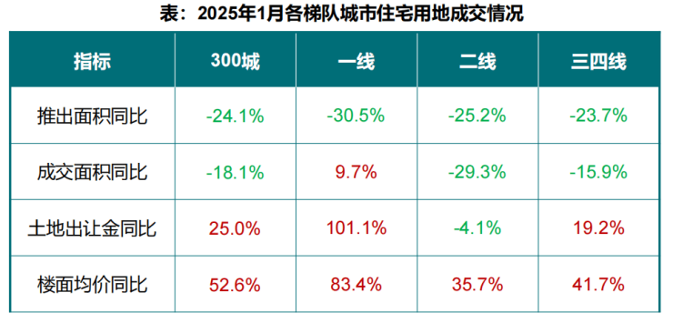 中指研究院数据显示,2025年1月,全国300城住宅用地成交规划建筑面积3300万平方米,同比下降18.1%;300城住宅用地出让金0.13万亿元,同比增长25%;住宅用地楼面价4139元/平方米,同比增加52.6%。