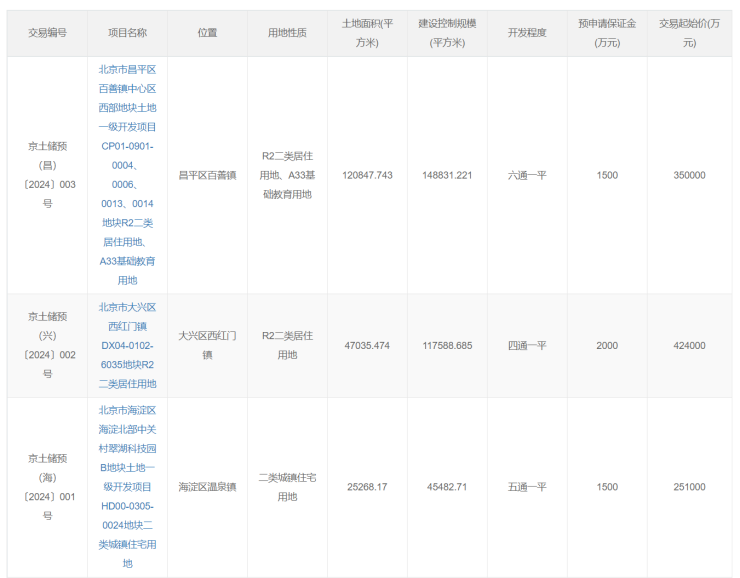 根据地块出让信息,3宗地块分别位于海淀区、大兴区以及昌平区,地块总土地面积约19.32万平方米,总建设控制规模约31.19万平方米,总起始价102.5亿元。
