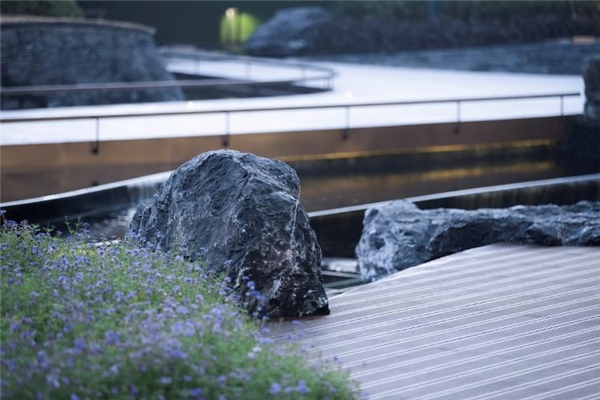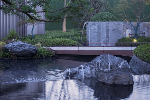 置石厚重沉稳,清泉相伴流淌,一高一低,一动一静,尽显自然诗意。
