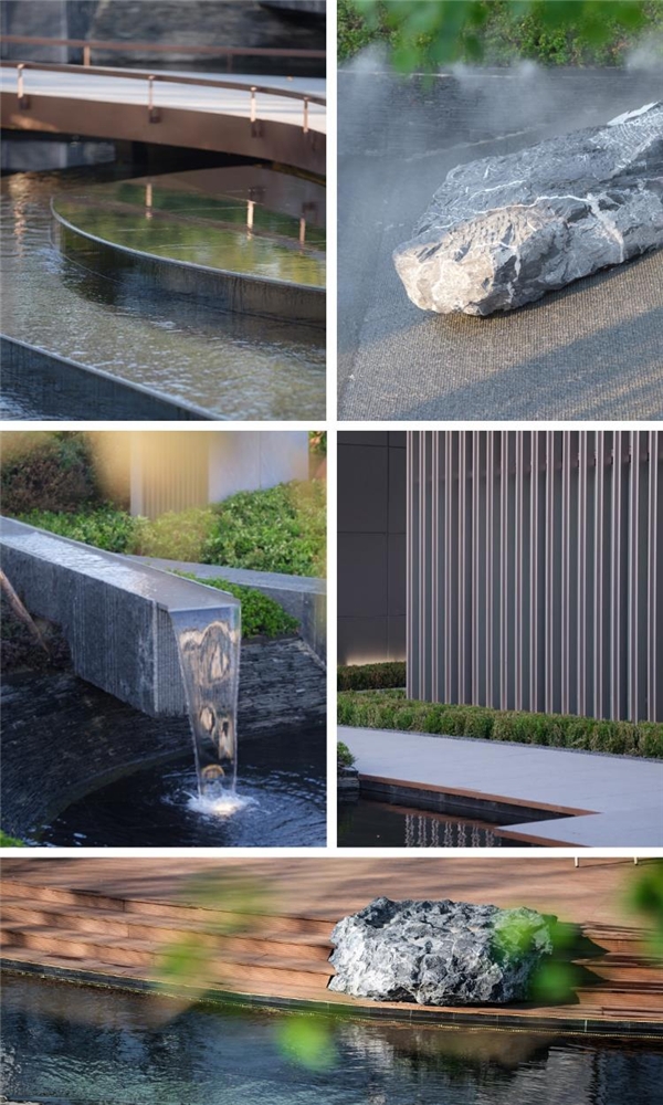 基于景观主题,我们运用了大量金属质感的材质,如入口处大面积金属板、格栅,细节处黑钛不锈钢水景包边、道路侧壁不锈钢外包及栏杆等,精工打磨,力求呈现细腻质感。
