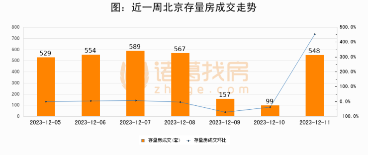 从存量房来看,2023年12月11日北京存量房单日成交548套,比昨日增加449套,环比上涨453.5%。从近一周存量房成交来看,北京存量房日均成交套数为434套,12月11日单日成交548套,高于近一周平均水平26.3%。
